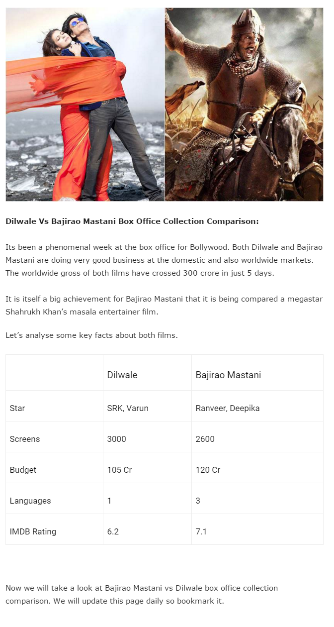 Dilwale Vs Bajirao Mastani Box Office Total Collection Dontcallitbollywood - The cast of bajirao mastani aka bajirao mastani includes deepika padukone, priyanka chopra, ranveer singh.