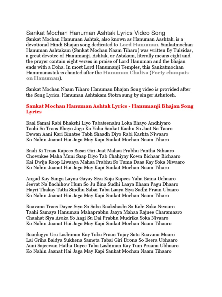 Hanuman Ashtak Lyrics In Hindi Text : Sankat mochan hanuman ashtak lyrics in hindi. Hanuman Ashtak Lyrics In Hindi Text - Sankat mochan hanuman ashtak lyrics in hindi.
