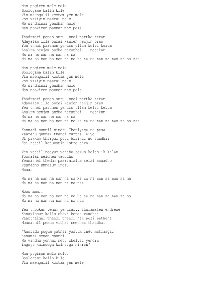 Naan Pogiren Song In 30sec 3gp Mp4 Hd Download - Naan pogiren mele mele boologame kaalin keezhe vinmeengalin kottam en mele poo vaaliyin neerai pole nee sinthinaai endhan mele naan pookkiren panneer poo pole thadumaari ponen andre unnai paartha neram adaiyaalam illaa ondrai kanden nenji noram yen unni paarhten endre ullam.