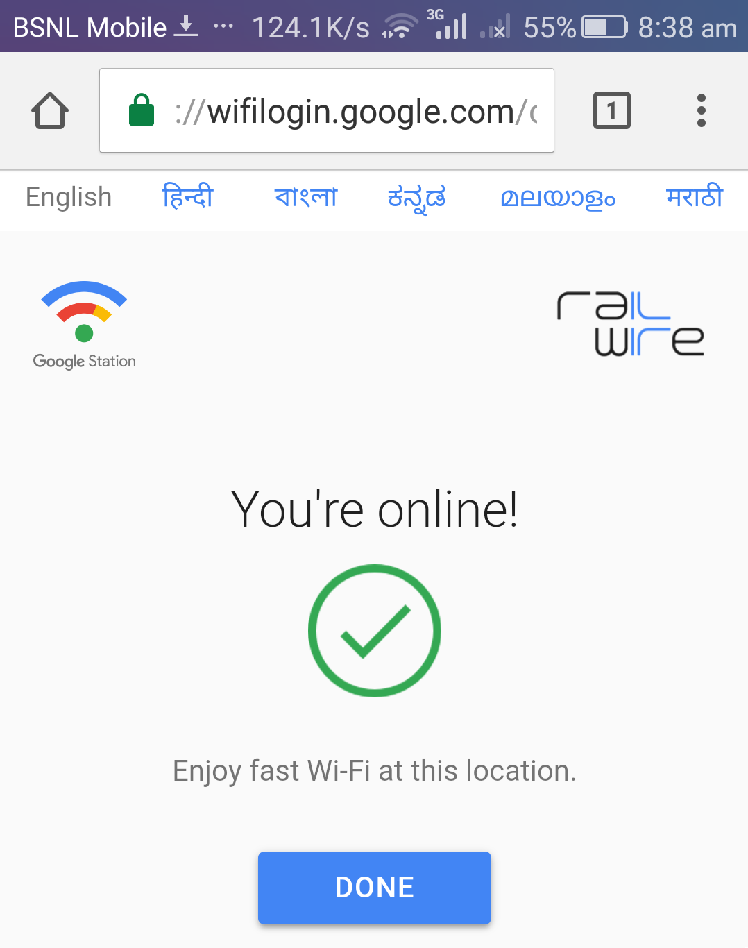 Railwire Connect / The first that u have to do is to connect with the railewifi.if u are connected without signing then probably ull get low speed kbps.